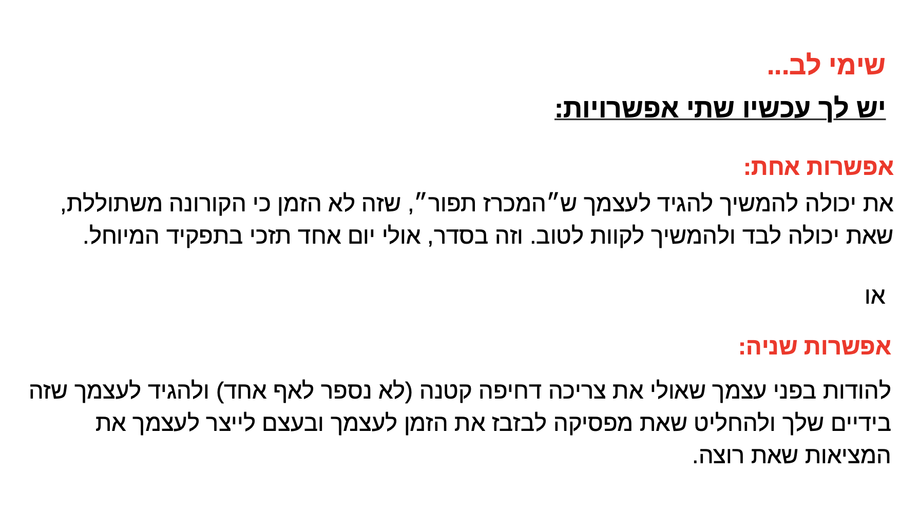 מפגש בן 45 דקות ובו נדבר על אבני הדרך שיובילו אותך לקראת התפקיד החדש שלך ובתוכו. מה שיאפשר לך ״נחיתה רכה״ בתוך התפקיד ויתן לך אפשרות לשאול שאלות, כך שלא תרגישי לבד. המפגש ייערך ב Zoom . שווי הבונוס: 750 ש״ח