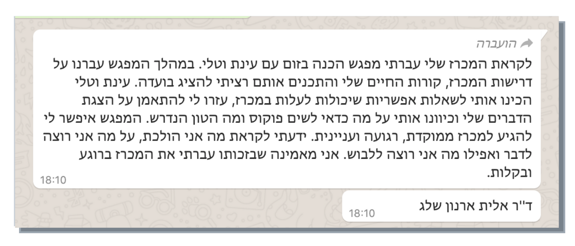 ״אחרי קורס אדיר משנה חשיבה, עינת וטלי לא נתנו לזה ליפול ברגע האמת ! מתוך הכרות אמיתית הן עזרו לי להתכונן למכרז באופן שמותאם אישית וספציפית לצרכים שעלו במרוץ ולצרכיי האישיים, עזרו לי לזקק את החשיבה על המסרים, להתגבר על העכבות ולהאמין במה שיש לי לתת. אני מודה לכן מקרב לב ואשתמש בכלים שנתתן לי גם בהמשך ❤️ ד״ר אמילי אביטן
