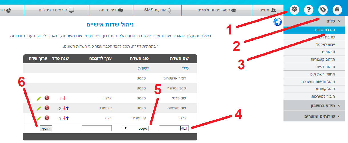 2.1. ניתן להכנס ל-הגדרות > כלים > הגדרת שדות, ולייצר שם שדה REF חדש, שיהיה שדה מסוג טקסט.