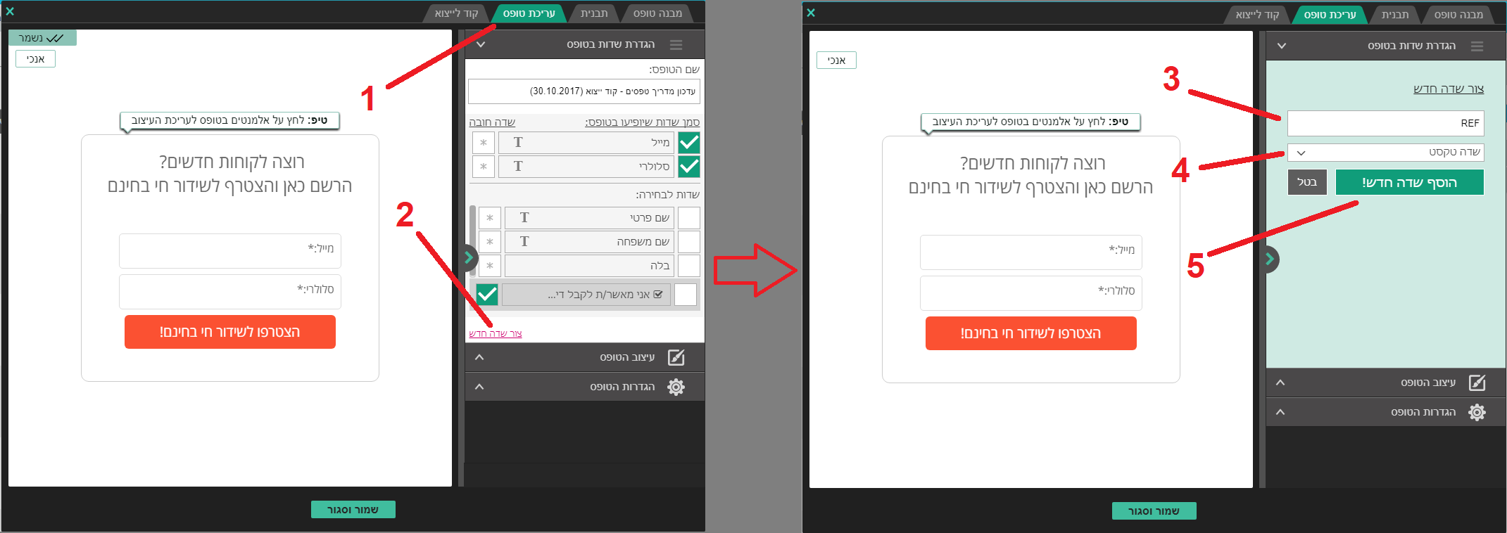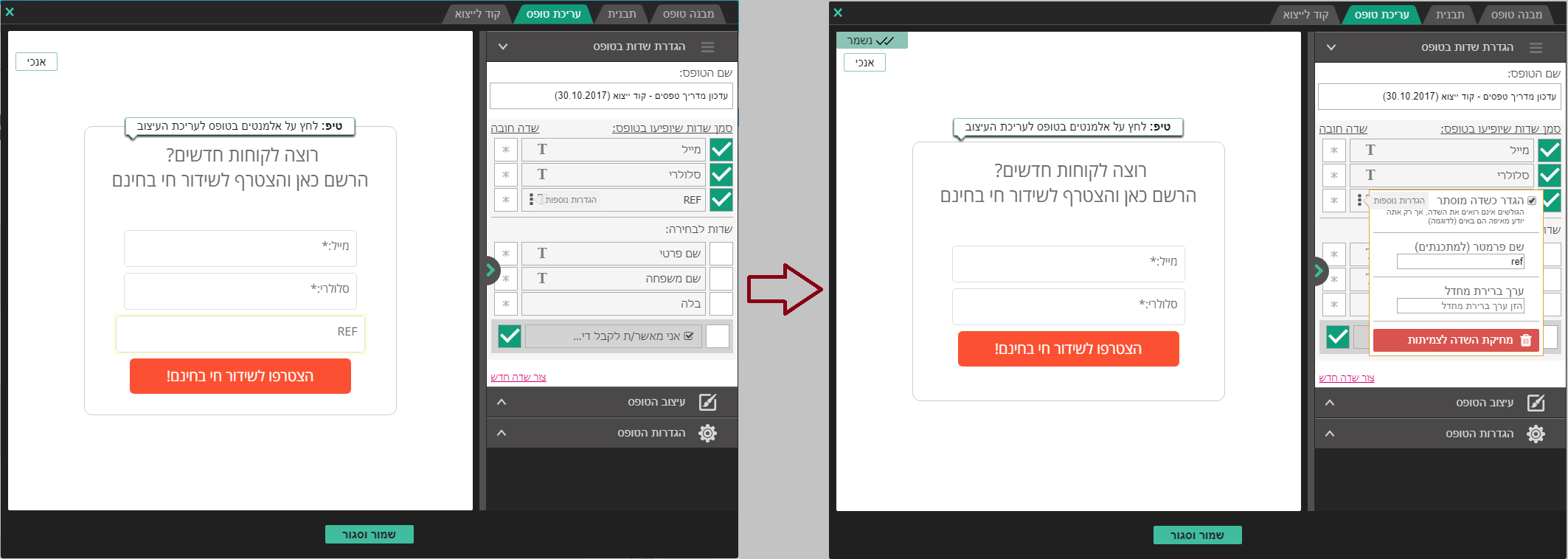2.2. בעת עריכת הטופס שיצרנו, ניתן לייצר שדה חדש. פשוט יש לייצר שדה בעל השם REF ולהגדירו כשדה טקסט.