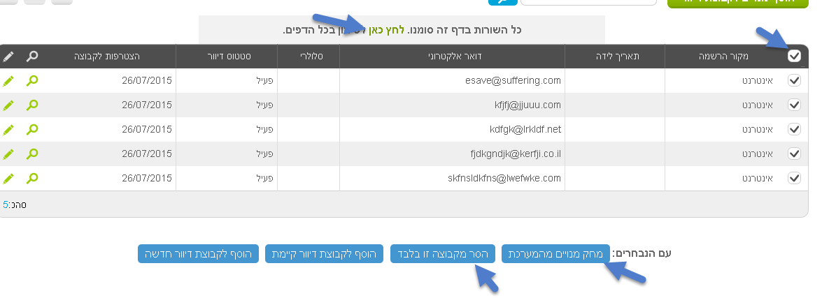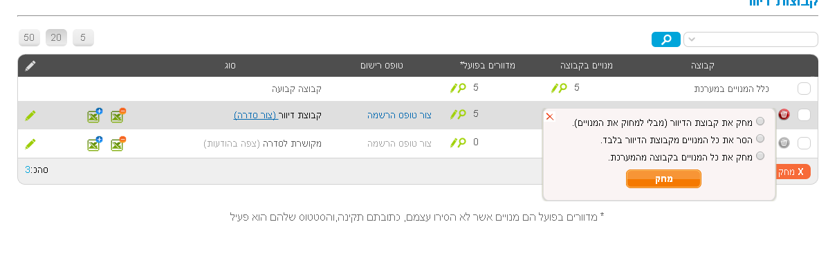 מחיקת כל המנויים מקבוצת הדיוור 1. הכנסו ללשונית "מנויים" ותחת הכותרת "קבוצות" בתפריט מימין, בחרו "קבוצות דיוור". 2. לחצו על סימן לצד הקבוצה הרוולנטית. 3. סמנו את האפשרות "הסר את כל המנויים מקבוצת הדיוור בלבד" או "מחק את כל המנויים בקבוצה מהמערכת" ולחצו "מחק".