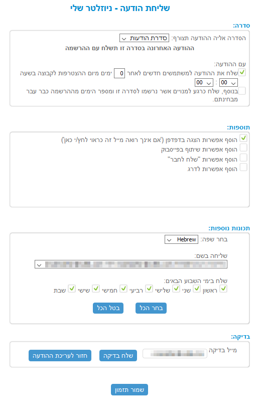 יצירת סדרת הודעות 1. כנסו ללשונית "קמפיינים וניוזלטרים" ובחרו באפשרות "סדרה חדשה". 2. תנו שם לסדרה ובחרו את קבוצת הדיוור אליה ישלחו ההודעות. 3. לחצו על "הוסף חדש". 4. לחצו על "+" בטבלה תחת הכותרת "הוספת הודעה". 5. צרו הודעה חדשה. ראו הדרכה "יצירת הודעה חדשה". 6. לאחר שסיימתם לערוך את ההודעה, לחצו על "לשלב הבא". 7. תוכלו לשלוח הודעת בדיקה. במידה אינכם מרוצים מההודעה תוכלו לחזור ולערוך אותה שוב. 8. קבעו את תזמון השליחה - כמה ימים לאחר ההצטרפות לקבוצה ובאיזה שעה תשלח ההודעה. תוכלו גם לשלוח מיידית למנויים אשר נרשמו לקבוצת הדיוור ומספר הימים לשליחת הודעה זו כבר עבר מבחינתם. 9. ב"תכונות נוספות" תוכלו לבחור את הימים בהם ההודעה תשלח, ולמנוע שליחה בימים אחרים.